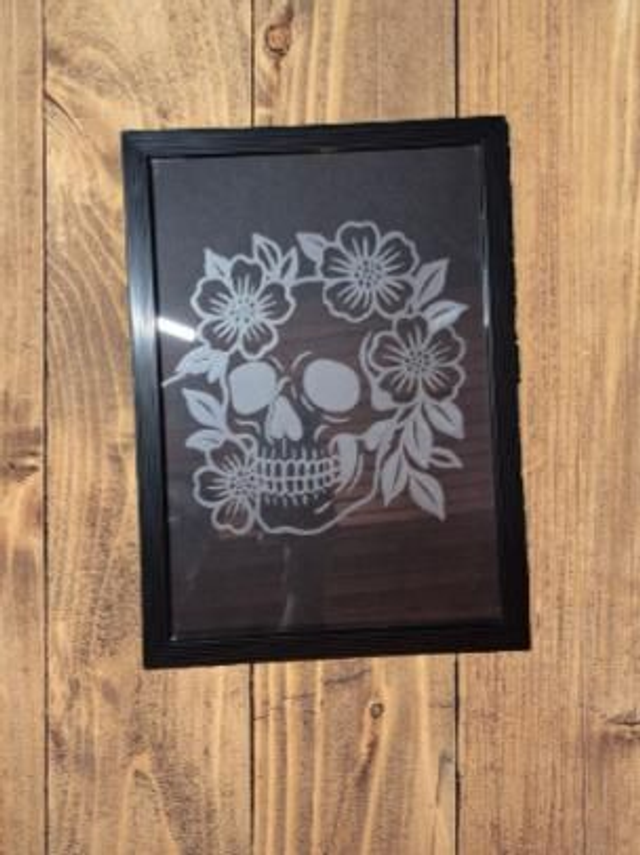 Envie d’une decoration iriginal et fleurie ? Ce crane graver a la main, sur du verre est pile ce qu’il vous faut !